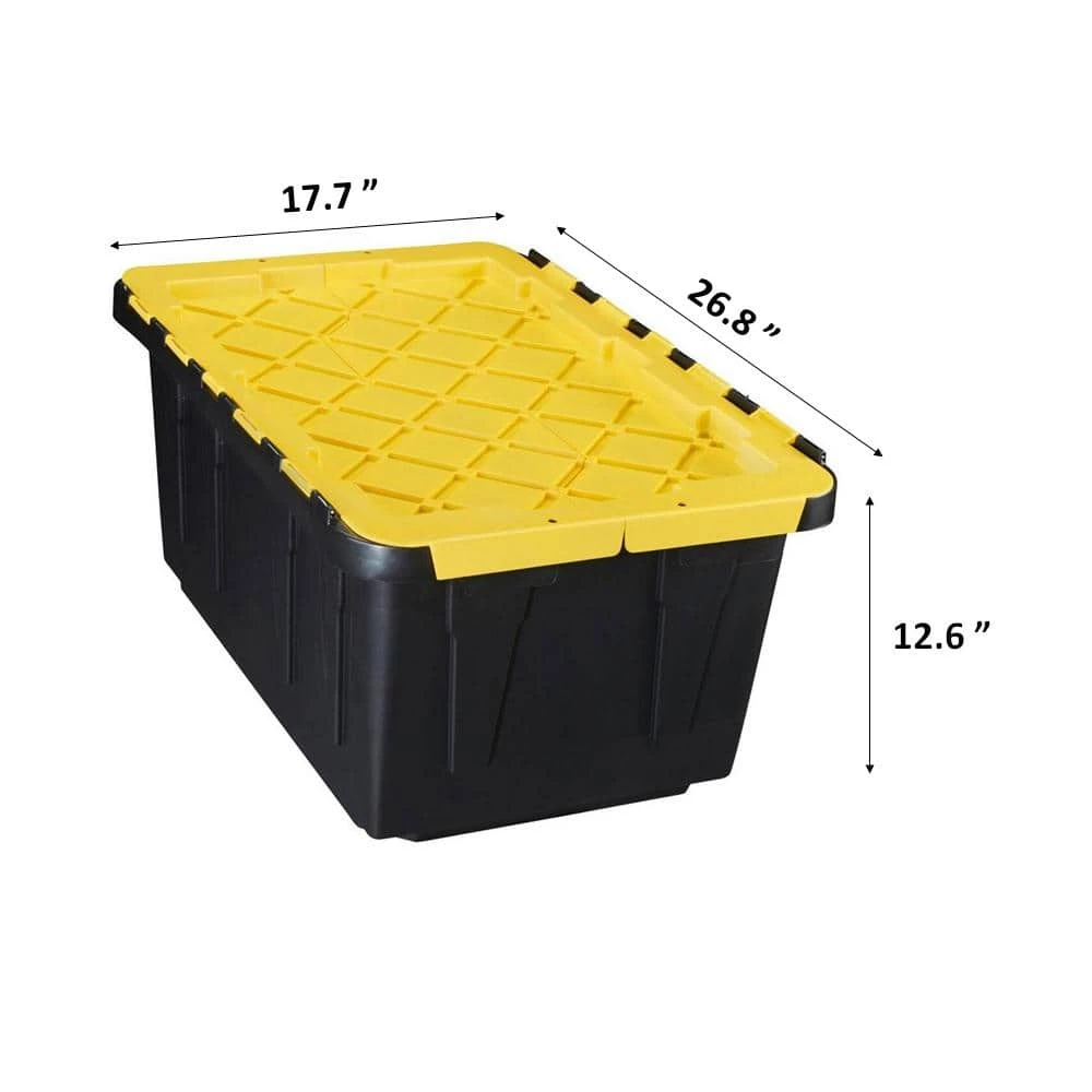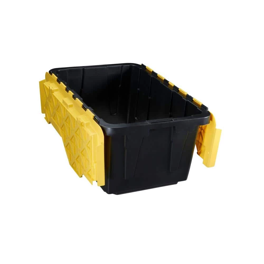 This HDX easy access flip top tote comes in a 17 Gal. capacity, allowing for plenty of storage space. The added metal hinges through the attached lid provides extra strength and durability for a more flexible use. Pre-drilled holes in the top of the lid are added to make these lockable and accept cable ties for security. When not in use, these storage containers can be nested to give you more storage space.