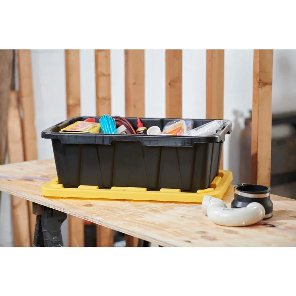 This HDX reinforced stackable 27 gallon heavy-duty tough tote will handle any storage job ranging from general storage needs to extreme storage jobs. The tote includes a black base made from durable recycled polypropylene and a yellow reinforced snap-fit lid to secure and protect your valuables. This tote is a perfect option for the meticulous organizer who demands the very best in heavy-duty storage and protection. Integrated slots make the tote lockable to keep away unwanted intruders. This tote includes innovative tie-down channels that allow it to be easily strapped down for simple transportation and fits most Hitch Mounted Cargo Carriers.