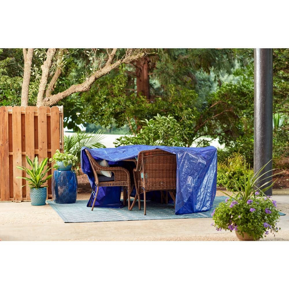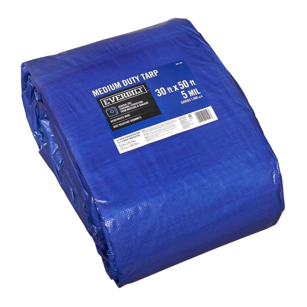 Everbilt medium-duty tarps are ideal for general purpose use and have many applications. It is widely used for construction, roof covering, agriculture, camping, boating, landscaping, outdoor furniture, and equipment covering. Features include thick heat-sealed seams reinforced with poly cords and rust proof aluminum grommets.