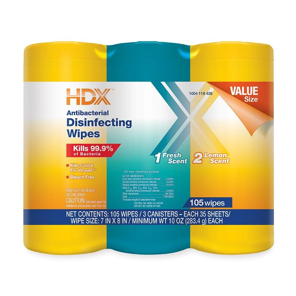 HDX Antibacterial Disinfecting Wipes clean and disinfect most hard non-porous surfaces and are perfect to use for touch-up cleaning. The wipes kill 99.9% of bacteria and are ideal for cleaning sinks, tubs, showers, stoves, counter tops etc. By using HDX Antibacterial Disinfecting Wipes, you can help keep your family healthy year round by reducing their exposure to bacteria.