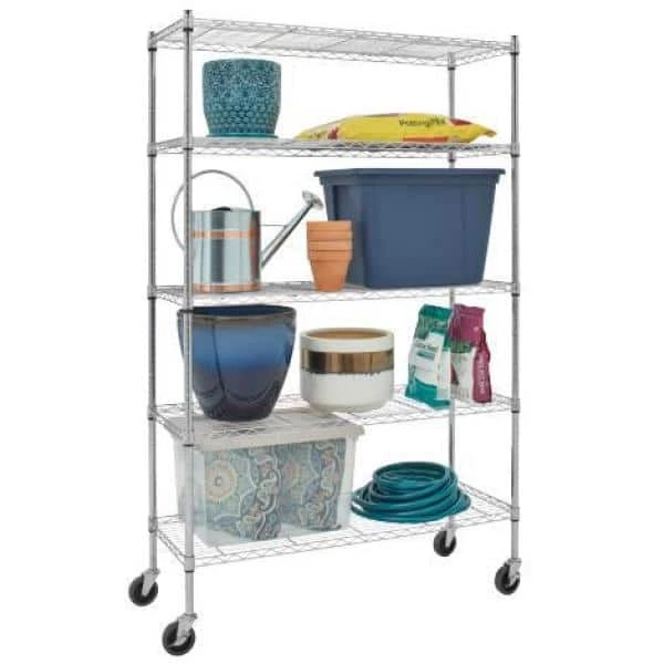 This easy-to-assemble 5-Shelf Decorative Wire Chrome Finish Commercial Shelving Unit from HDX provides storage space for any room and purpose including commercial, industrial and residential use. The 5-tier shelving unit is made of tubular steel and wires coated with a durable chrome finish. All shelf heights are easily adjustable and the unit can be assembled without any tools. Without casters, each shelf holds up to 350 lbs. when evenly distributed and features a total unit weight capacity of 1750 lbs. With casters, this units holds up to a total unit weight capacity of 660 lbs.