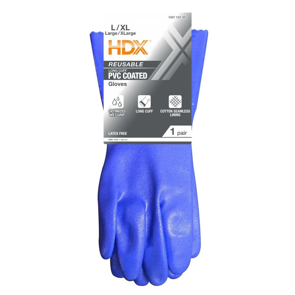 These HDX PVC Blue Large Multi-Purpose Gloves repel moisture. It also provides extended protection from household cleaning hazards thanks to their water-resistant long cuff design. This glove can take on everyday cleaning tasks along with heavy-duty tasks as well.