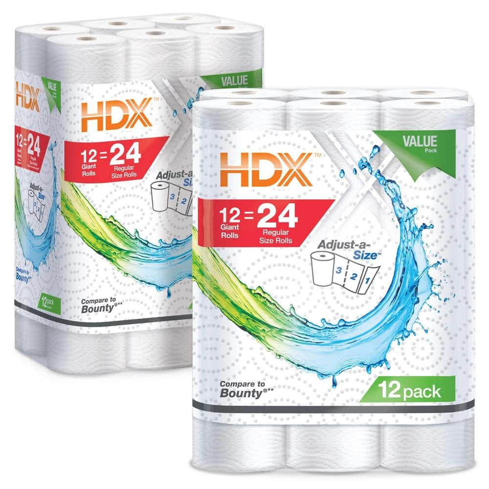 Providing superior cleaning, these HDX 2-Ply Paper Towels are ultra-absorbent. Perfect for mopping up spills and still hold up for tough scrubbing. Easily tear only what you need with the Adjust-A-Size sheets.